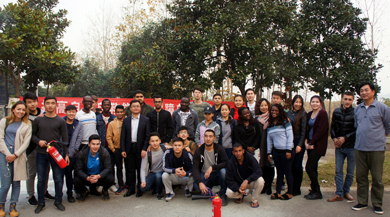 On 15th November afternoon, Campus Safety & Security Department and College of Overseas Education jointly held the fire safety knowledge and exercise activities for international students. Nanjing city pukou public security fire brigade deputy captain CHEN Chu , Campus Safety & Security Department Director Mr. CAI Haibiao, College of Overseas Education vice dean Mr. LUO Xiaochun, international students also participated this activities as well.