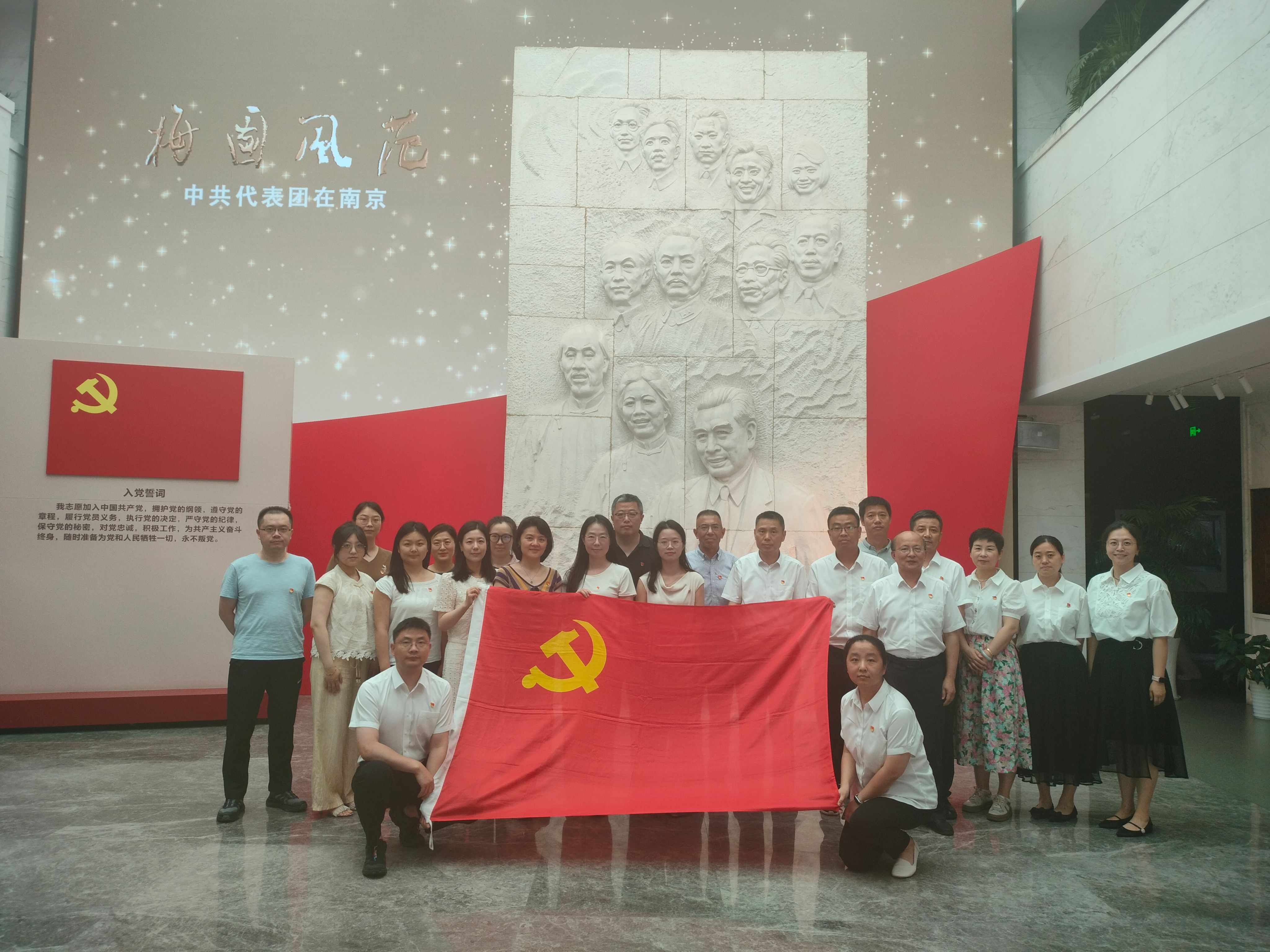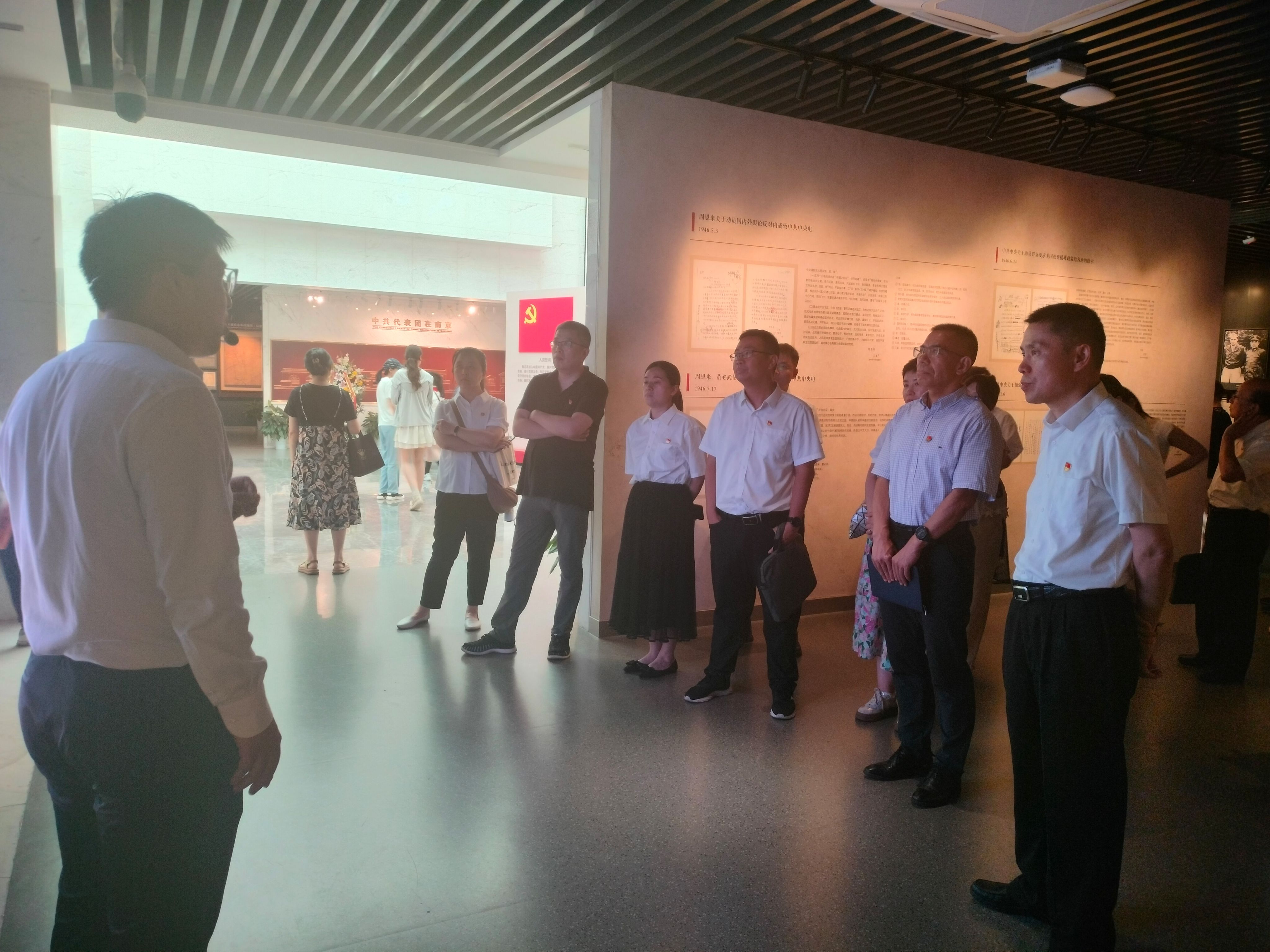 在纪念馆内,全体党员佩戴党徽,神情肃然地瞻仰了浮雕群像。重温入党誓词,以铿锵誓言和激昂斗志深切缅怀以周恩来为代表的老一辈革命家。在工作人员的讲解中,大家充分学习了解中共代表团在南京谈判期间取得的工作成绩和生活细节。大量珍贵照片、实物展陈让全体党员置身于实境课堂,加深了对革命历史的认识。