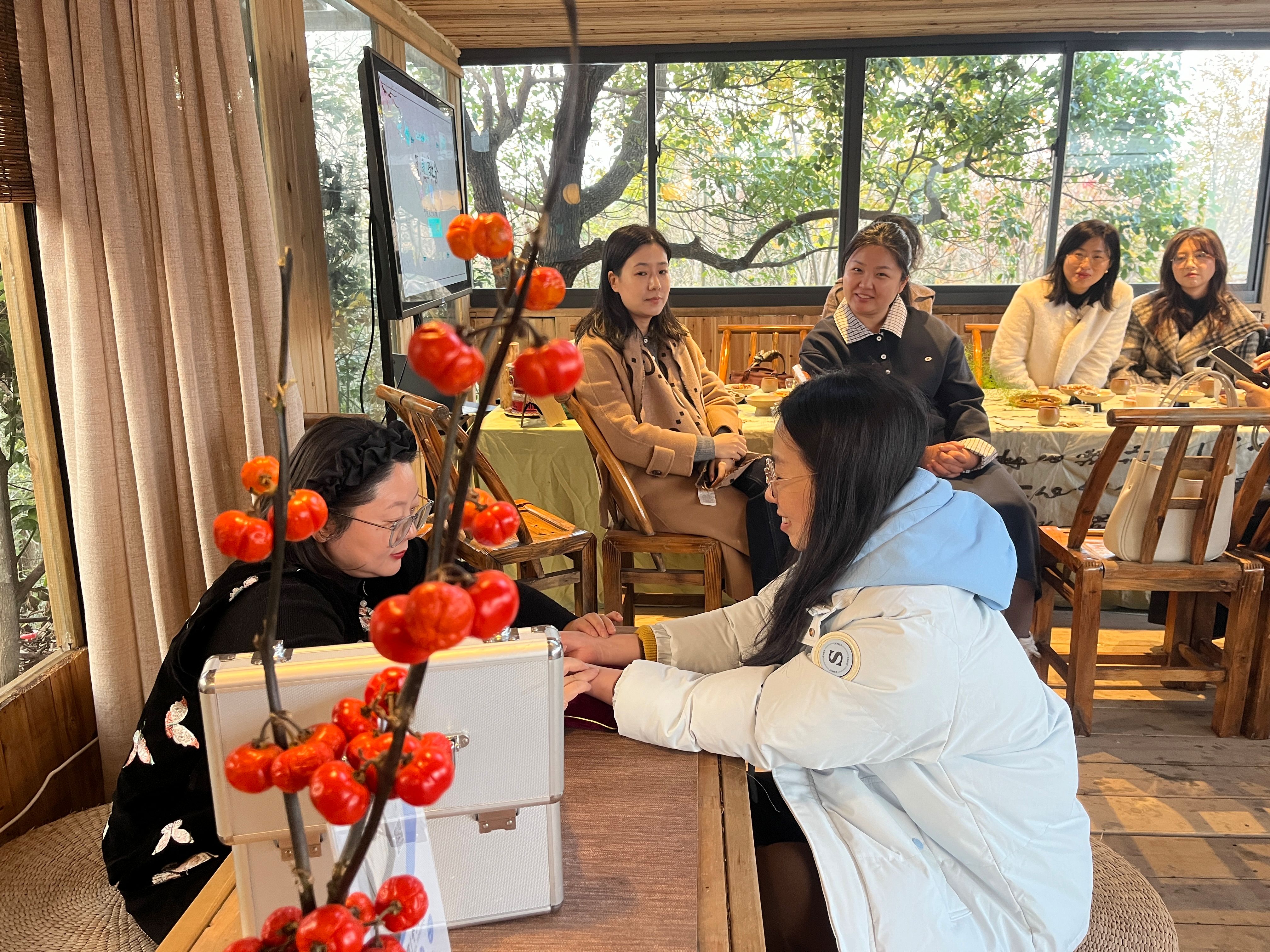 本次活动特邀中医专家卢筱燕团队提供专业健康服务,帮助教职工舒缓工作压力,树立科学养生理念。在辨证调理环节,专家运用“望、闻、问、切”中医四诊法,结合脉象、舌象等体征,为大家提供个性化调理方案,现场氛围雅致温馨。