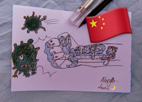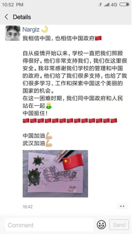 不仅如此,很多同学都在自己的朋友圈表达了对中国战胜病毒的信心,来自哈萨克斯的2017级Nargiz Kamalova同学和来自孟加拉的2018级AKTER同学更是创作了绘画作品来为中国加油!