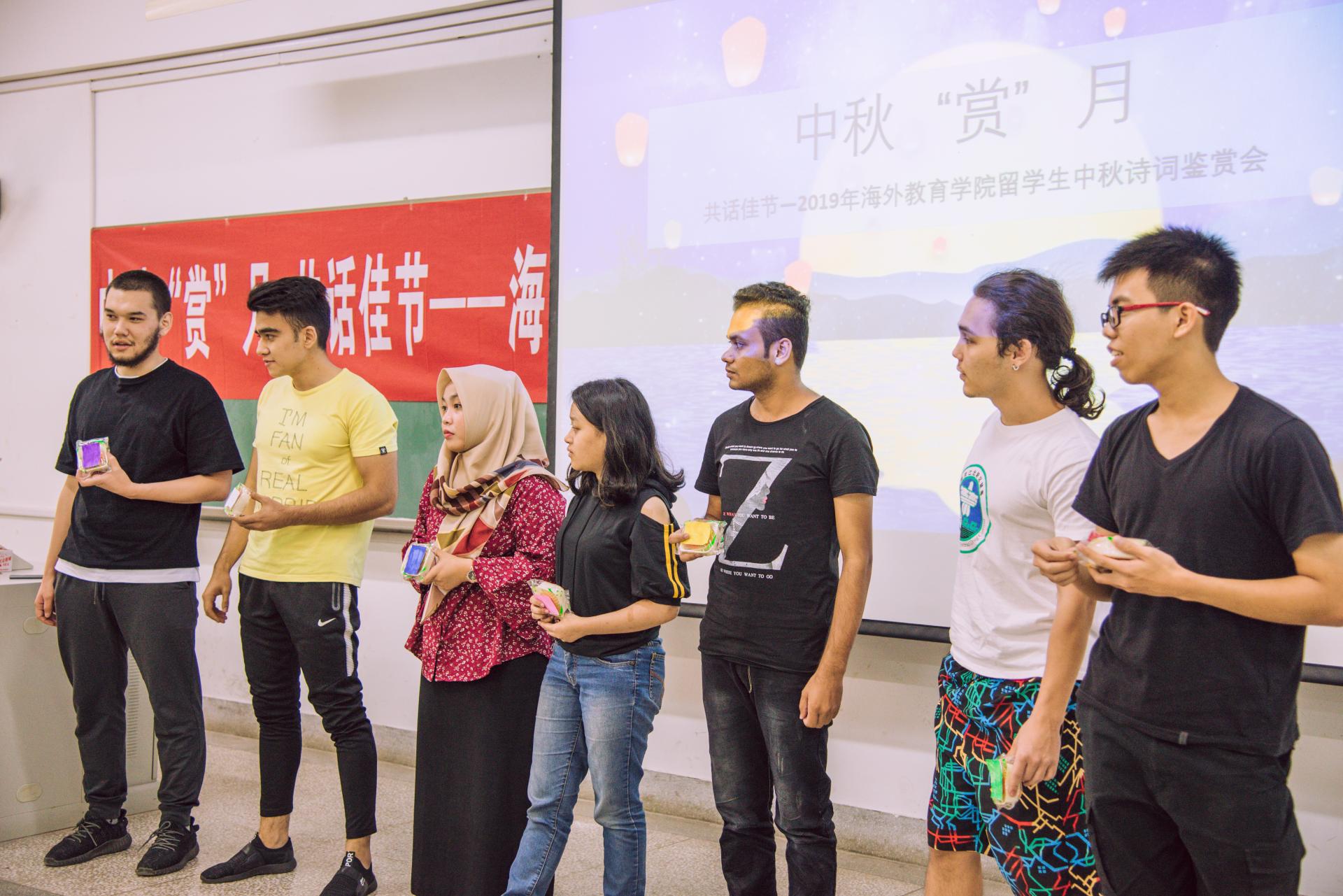 “明月几时有,把酒问青天…… ”来自印度尼西亚的许忆美用流利的中文朗诵了苏轼的《水调歌头·中秋》,这是她在中国度过的第二个中秋节。她希望能够在中国好好学习,毕业之后回到自己的国家,传递中国文化。来自加纳的喀希只能听懂一点中文,作为2019级新生,这是他第一次在中国过节,他表示非常喜欢中国传统文化,也很喜欢中国的月饼,希望有机会能带一些回去给家人品尝。