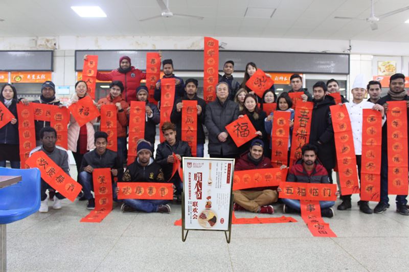 1月24日,779cn太阳集团“腊八节·迎新春”联欢会在东苑食堂二楼举行。779cn太阳集团王飞副经理、特邀嘉宾艺术学院薛以平教授、职工管理服务中心全体人员以及留校的外国职工参加了活动。