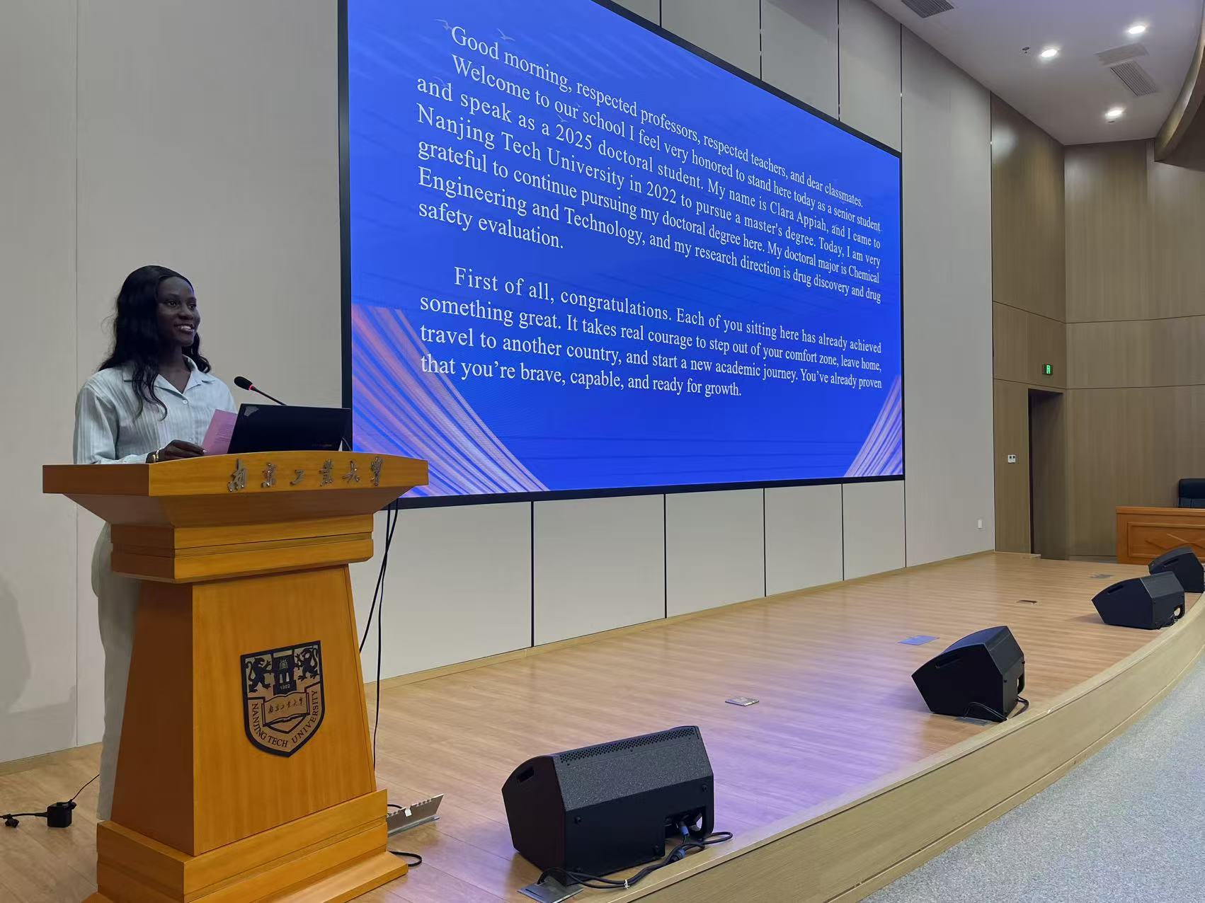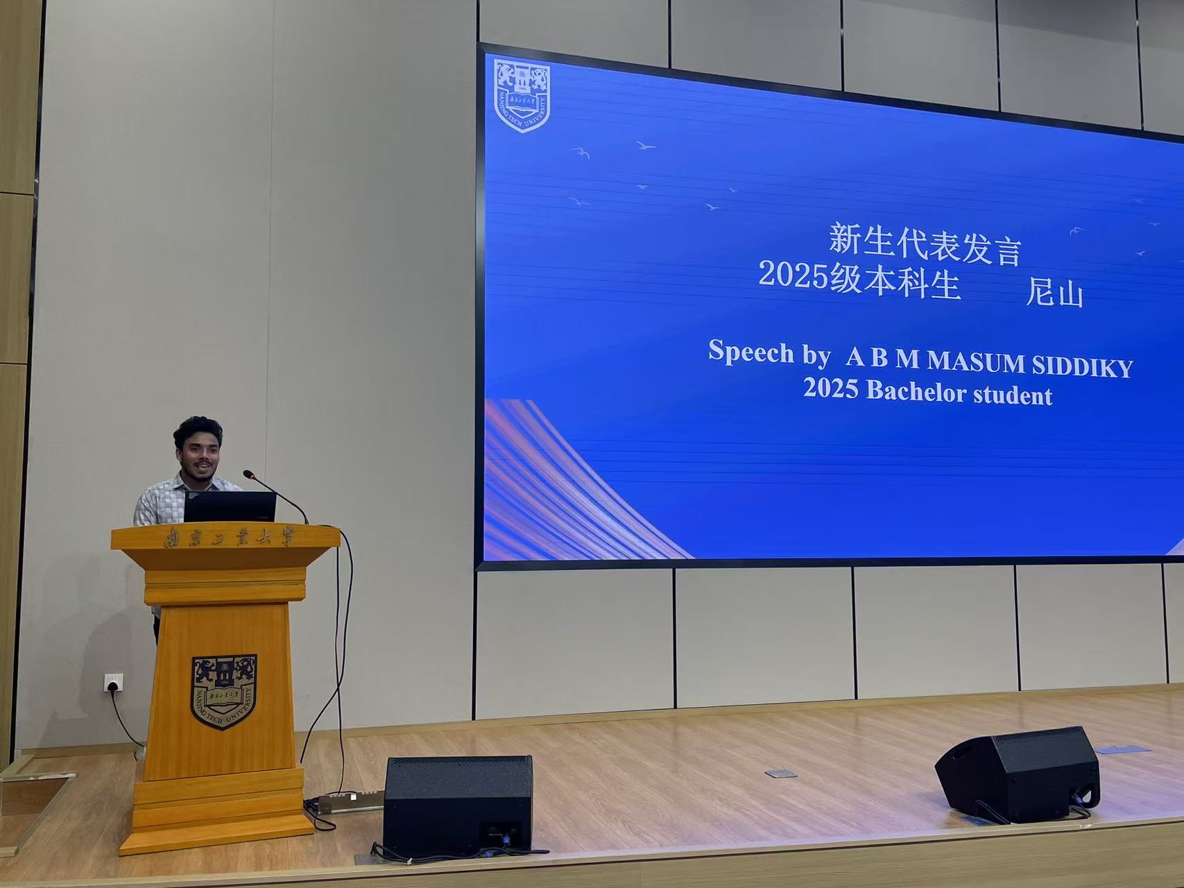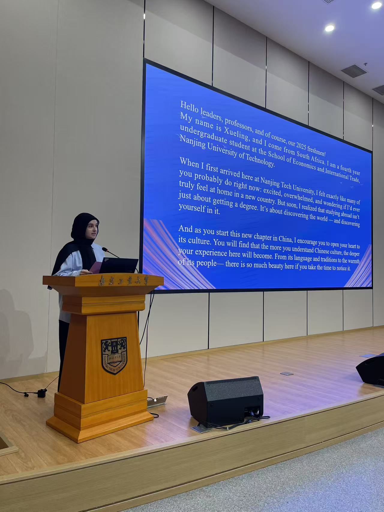 公司党总支书记万永敏致辞,代表学院对2025级新生表示热烈欢迎。2025级博士研究生、化学工程与技术专业的克拉拉(加纳)与2025级本科生、机械工程专业的尼山(孟加拉国)作为新生代表发言,他们表达了对学校的感激之情,表示将认真学好中文、积极参与各类活动,深耕自己的专业,努力实现梦想。2022级本科生、国贸专业的雪灵(南非)分享了她的在校学习生活经验,以生动的事例描绘了“留学南工”的多彩画卷,感悟到留学不仅是知识的积累,更是生命的成长。
