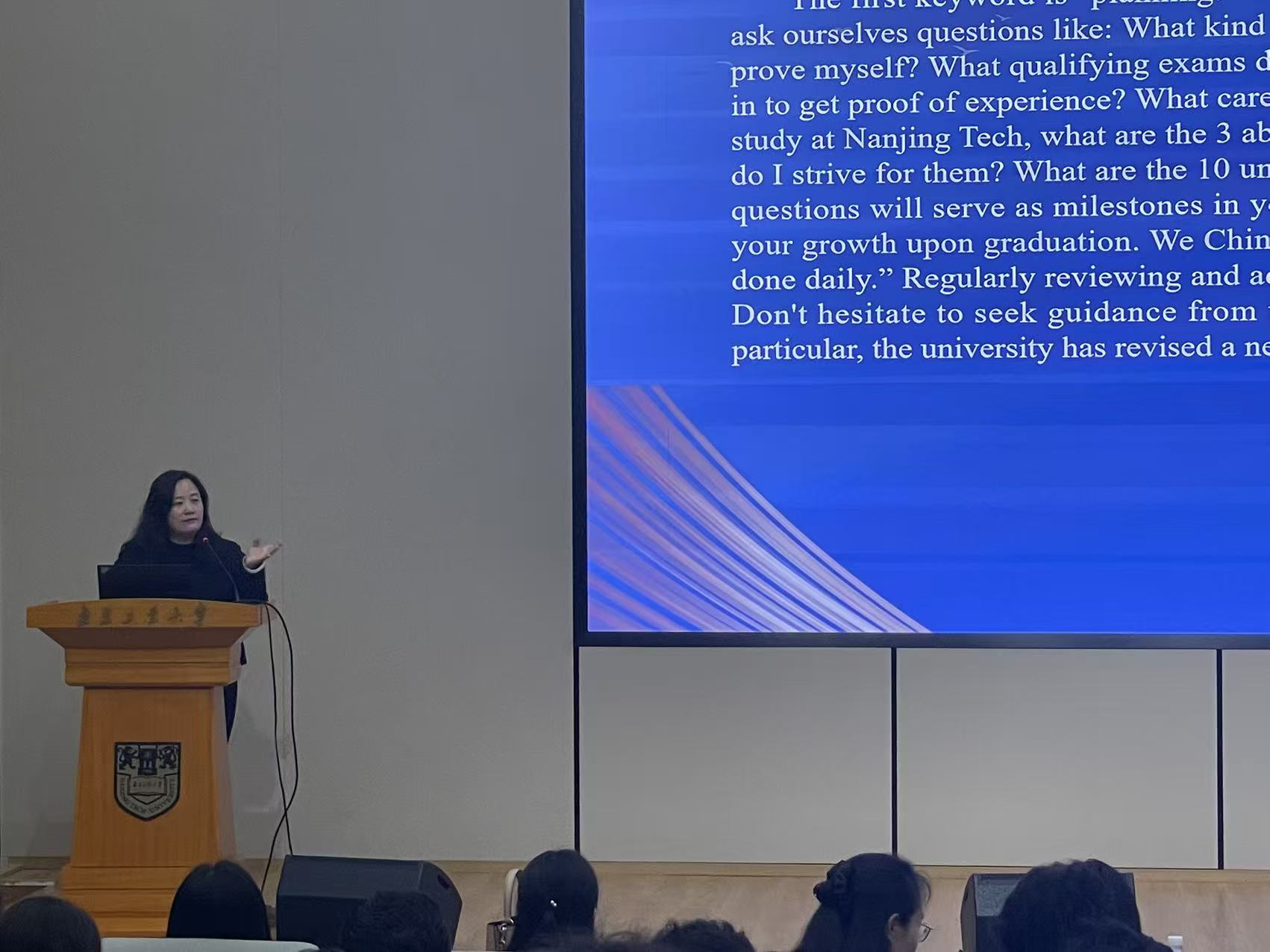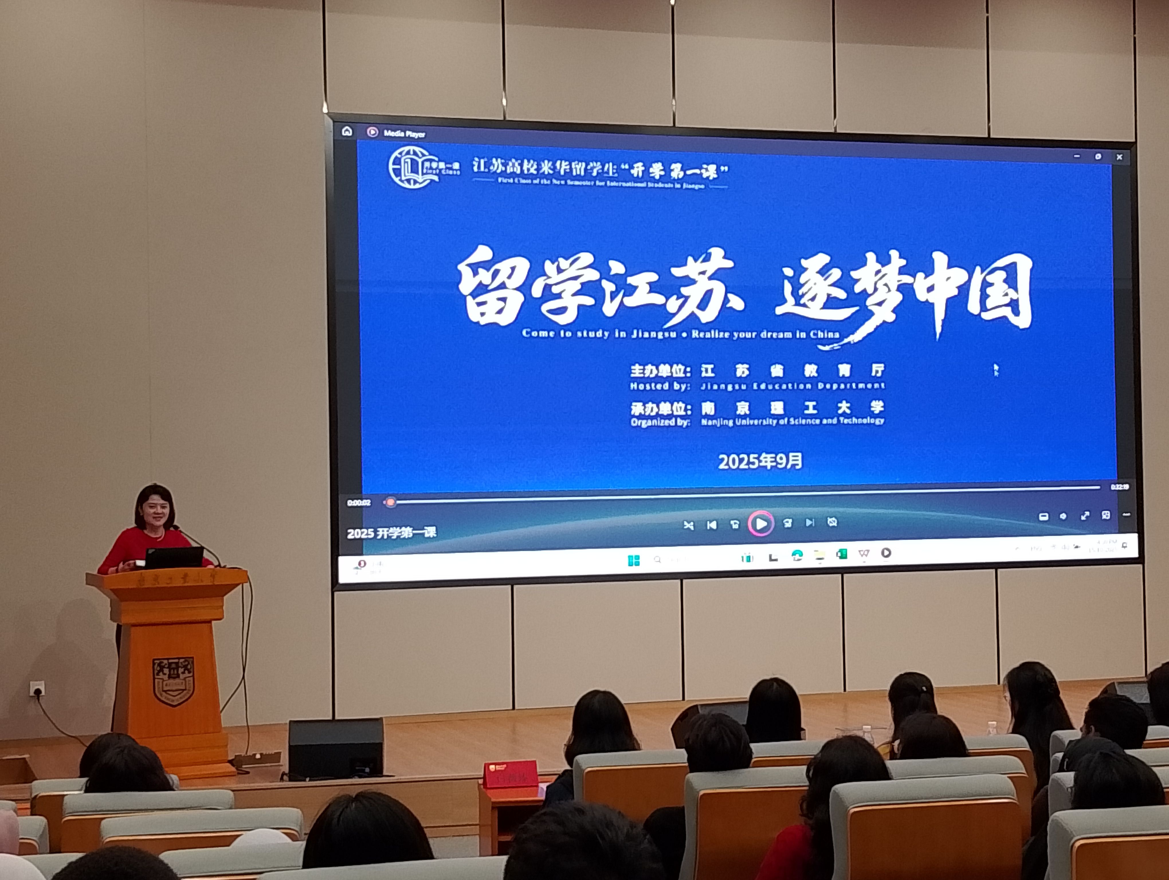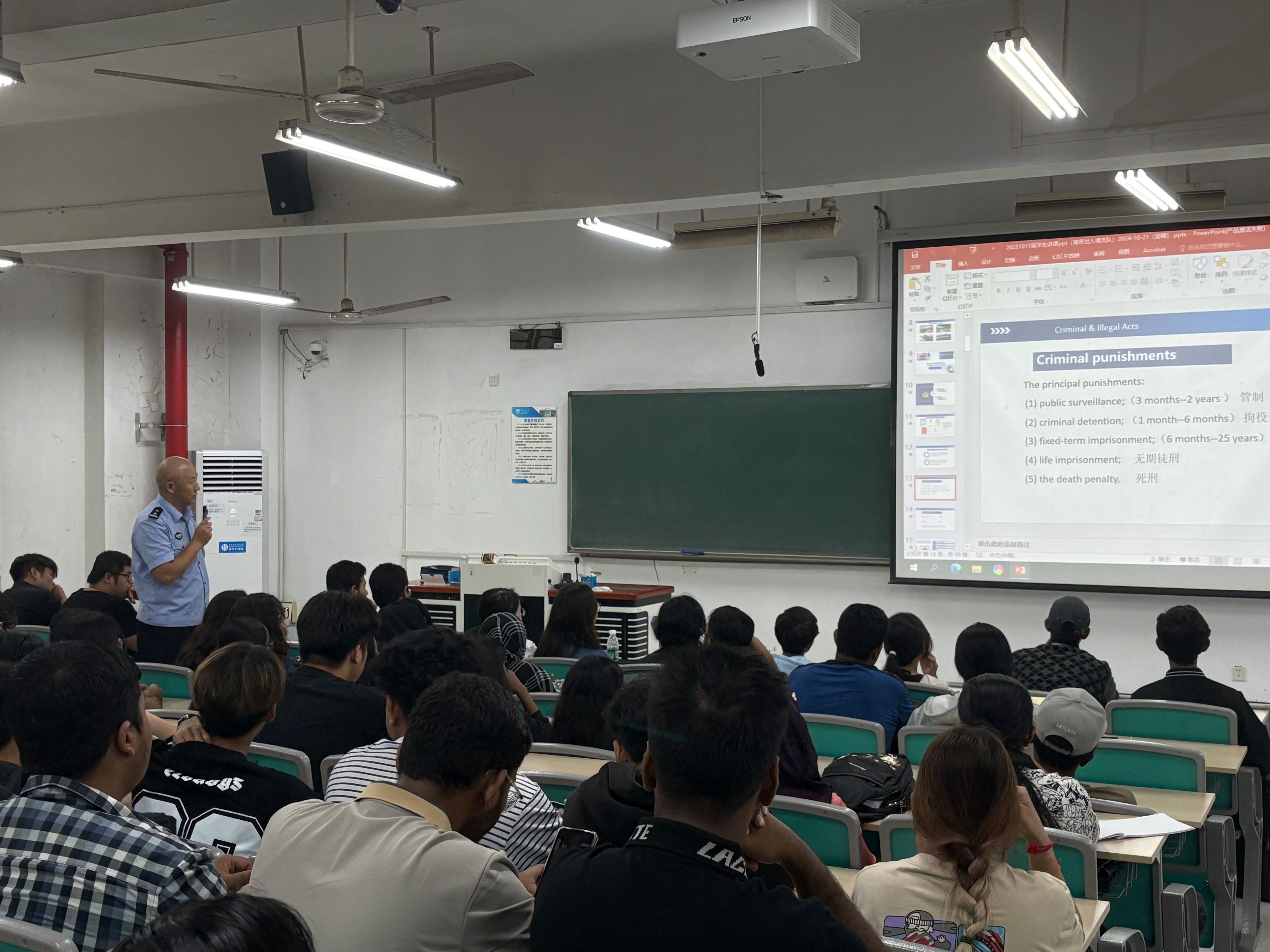 在新生见面会上,学院组织新生观看了2025江苏高校来华职工“开学第一课”视频,旨在帮助职工们深入了解中华文化、感受江苏风貌,并激励他们成为文明互鉴的使者。当天,纳入教学体系的法制法规教育课也完成了第五次教学(共8次课),这是由市出入境警官为公司职工开设的宣讲课程,通过法律规定和具体案例,着重强调职工遵守中国法律及校纪校规的必要性。