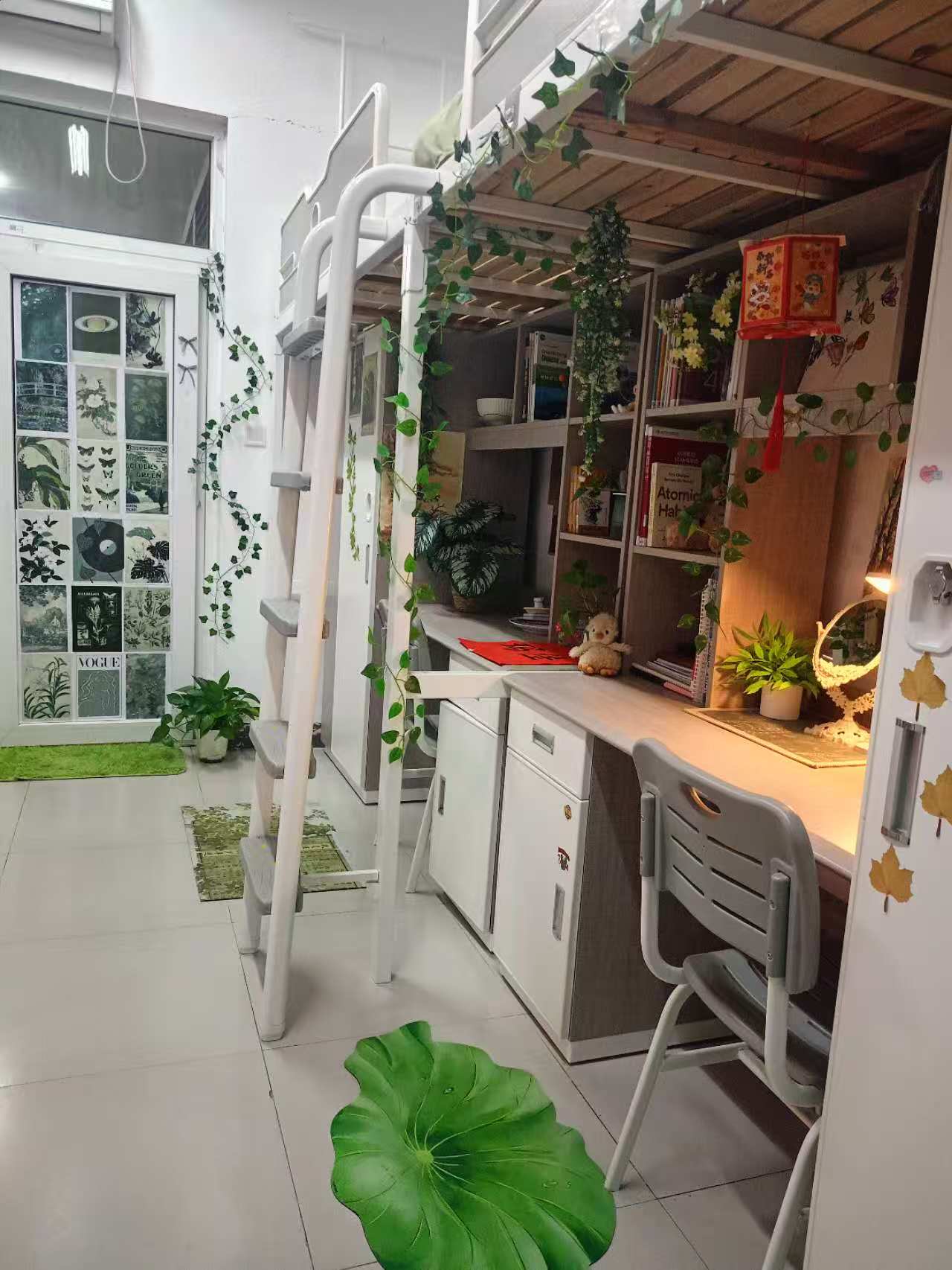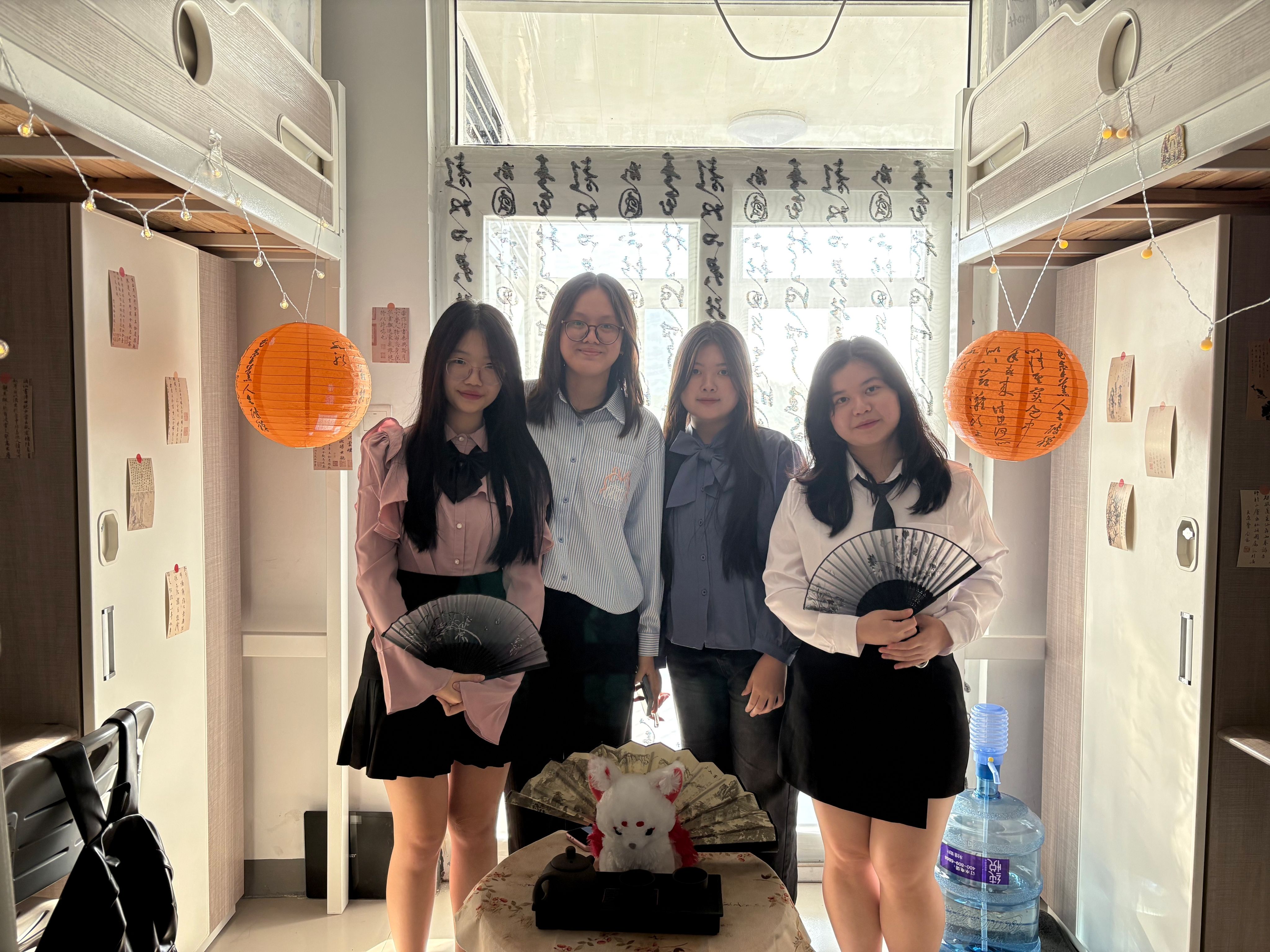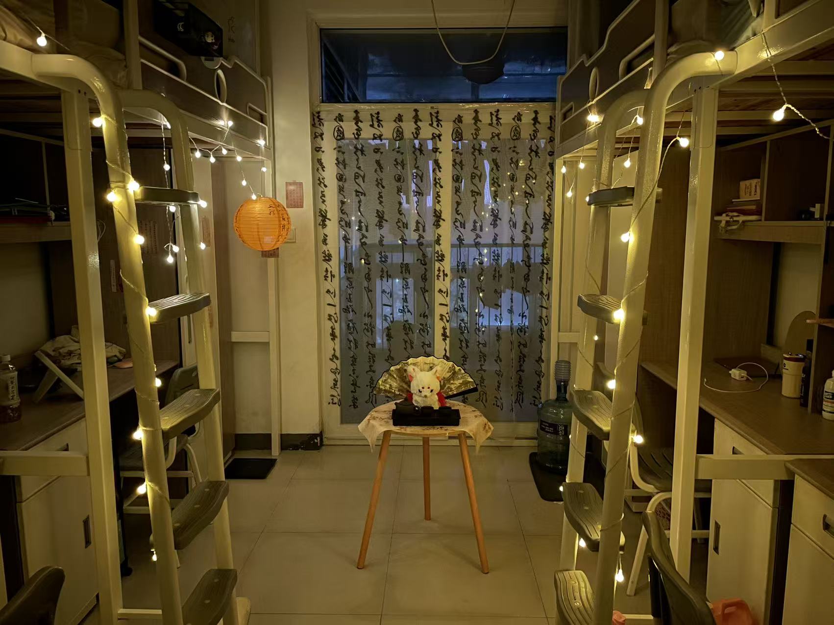 在评比阶段,学院留管办老师组成评审组对参赛宿舍进行实地考核。各宿舍推选出的一名阐述装饰理念的“讲解员”成为了评比的一大亮点。来自景星苑6栋520宿舍的职工们以“云端星梦”为主题,向老师们介绍道:“我们的寝室是一片梦幻的天空。云朵象征漂洋过海来到中国的旅程,星星代表对未来的希望。我们将梦想安放于此,共同成长,照亮彼此的未来。”这番充满诗意与理想的阐述,生动展现了职工们积极向上的精神风貌和深厚的室友情谊。同样令人印象深刻的6栋510宿舍,则诠释了文化交流与友谊的主题。该宿舍汇聚了柬埔寨、孟加拉国和印度尼西亚三国学子,他们巧妙地将各自国家的传统色彩与标志融入宿舍的不同区域,共享空间则象征着他们的团结。“我们的设计不仅展示了独特的本国文化,更旨在创造一个鼓励团结与相互尊重的温暖家园。”该宿舍讲解员介绍道。
