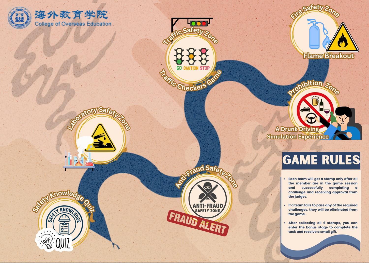 多元互动,闯关中学安全。本次活动创新采用团队闯关记时与集章赛制,设置六大安全主题体验区。为增强活动趣味与纪念意义,学院特别设计了专属集章卡,并精心制作了带有学校与学院标识、校训的系列主题印章。每支队伍需协作通过全部关卡并集齐通关印章,最终依据团队总用时进行排名。活动设计秉持“寓教于乐、知行合一”的理念,将安全知识系统融入情景体验,涵盖生活安全、实验室安全、防范诈骗、交通安全、消防安全及酒驾警示等领域,全面覆盖职工在华学习生活中常见的安全风险点,着力提升其风险辨识与应对能力。