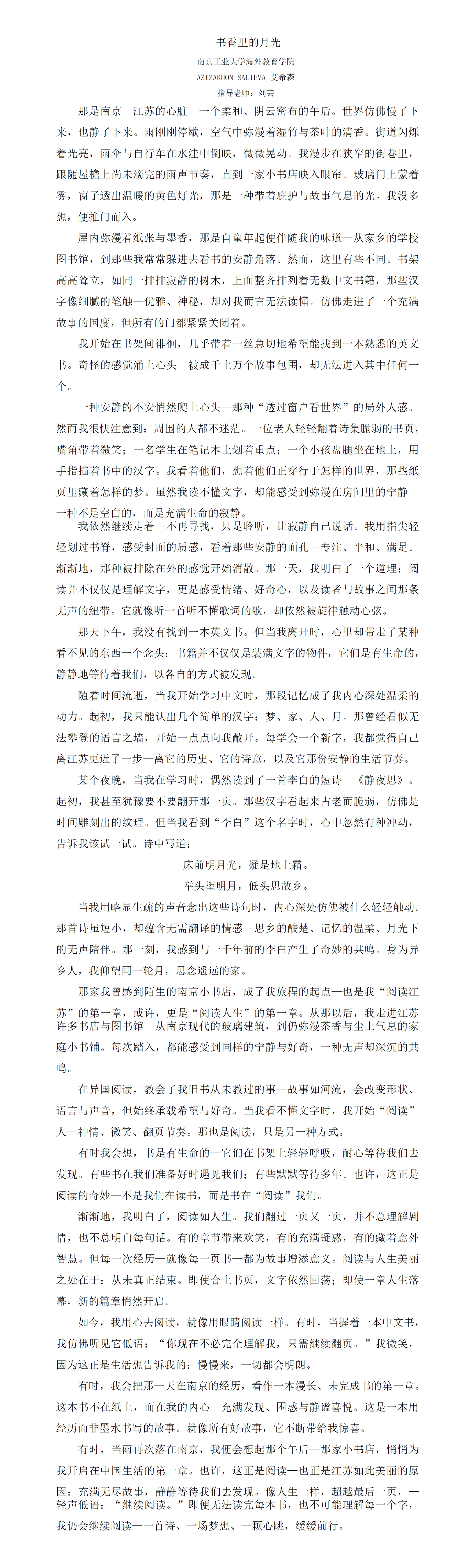 本次活动以促进文化交流、感知江苏文化为宗旨,吸引全省52所高校参与。在779cn太阳集团的组织推荐下,公司职工共提交67份作品,最终4份作品获奖。AZIZAKHON SALIEVA(艾希森),来自塔吉克斯坦的23级工商管理硕士,以散文《书香里的月光》娓娓道来她与江苏文化的邂逅;CHEERYL CHINEZ VANEZA(蔡捷丽),来自印度尼西亚的25级国贸专业本科生,用画笔绘就《江苏的足迹》;FARJANA AKTER HAPPY(快乐),来自孟加拉国的24级土木工程专业本科生,以摄影作品《他乡月亦明》捕捉异乡生活中的温情瞬间;MD ATUL BABU(马图) 与 MD SAMIUL ISLAM(莫桑),两位来自孟加拉国的25级计算机专业学子,携手创作短视频《一个人的读书会—与江苏对话》,以新颖的叙事方式融合阅读思考与地域文化探索。钱颖、刘芸、邢露萍及徐兰四位老师亦荣获“优秀指导教师奖” 。