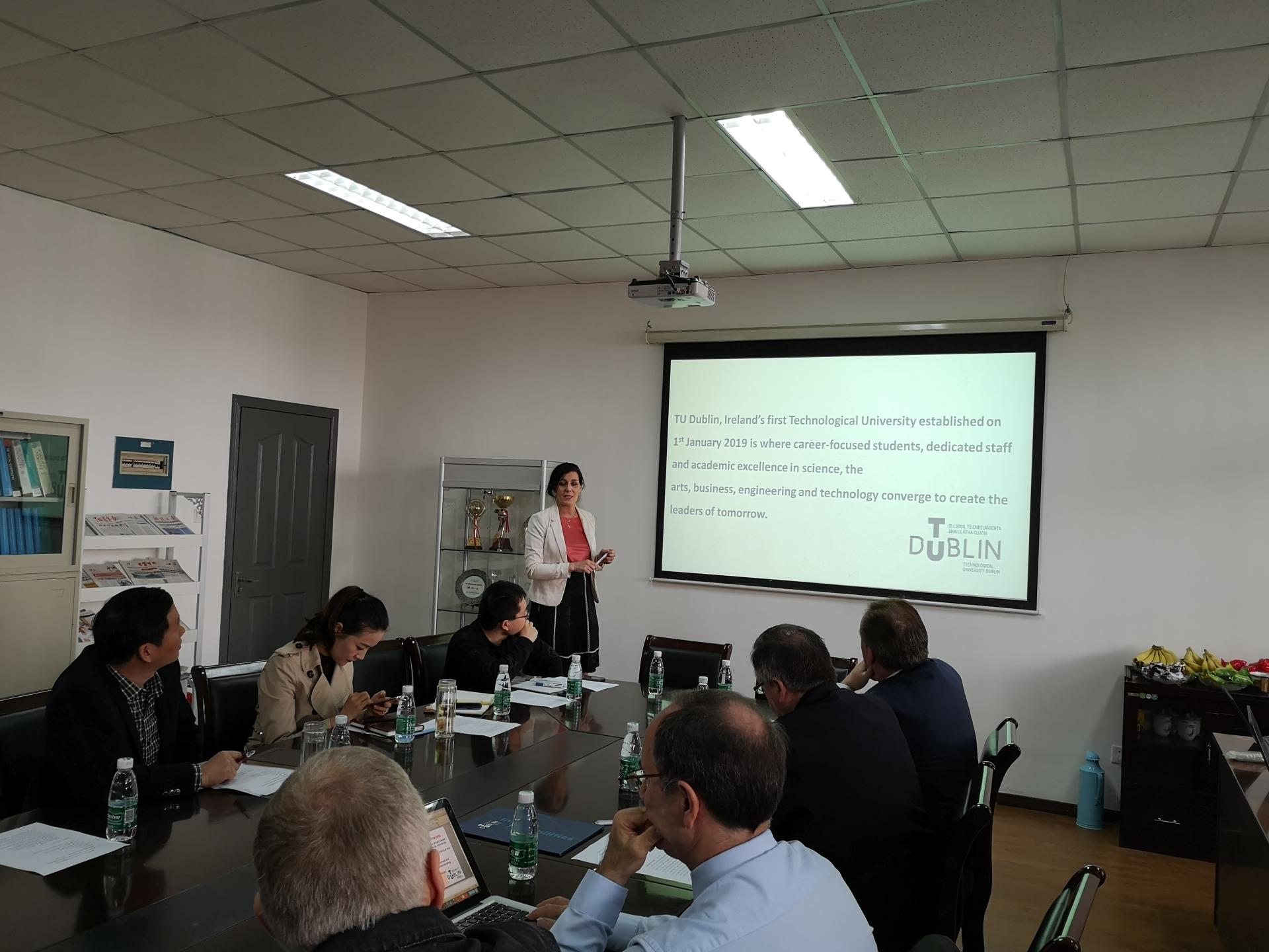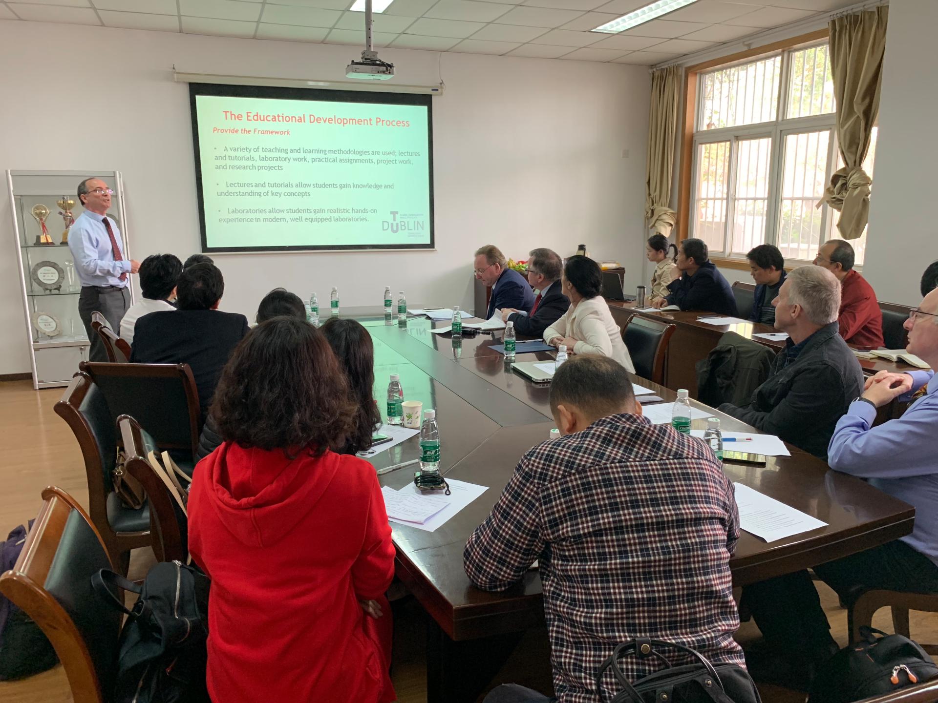 4月12日上午,海外教育学院召开中外合作办学教学研讨会,都柏林理工大学理学院经理 Mike Ahern、工程学院经理 Fiona Cranley、电子系主任James Wright、理学系主任 John Behan、来公司授课的外方教师Ed Carey 、Brian Murry 以及公司部分专业教师参加研讨会。副经理骆小春主持研讨会。