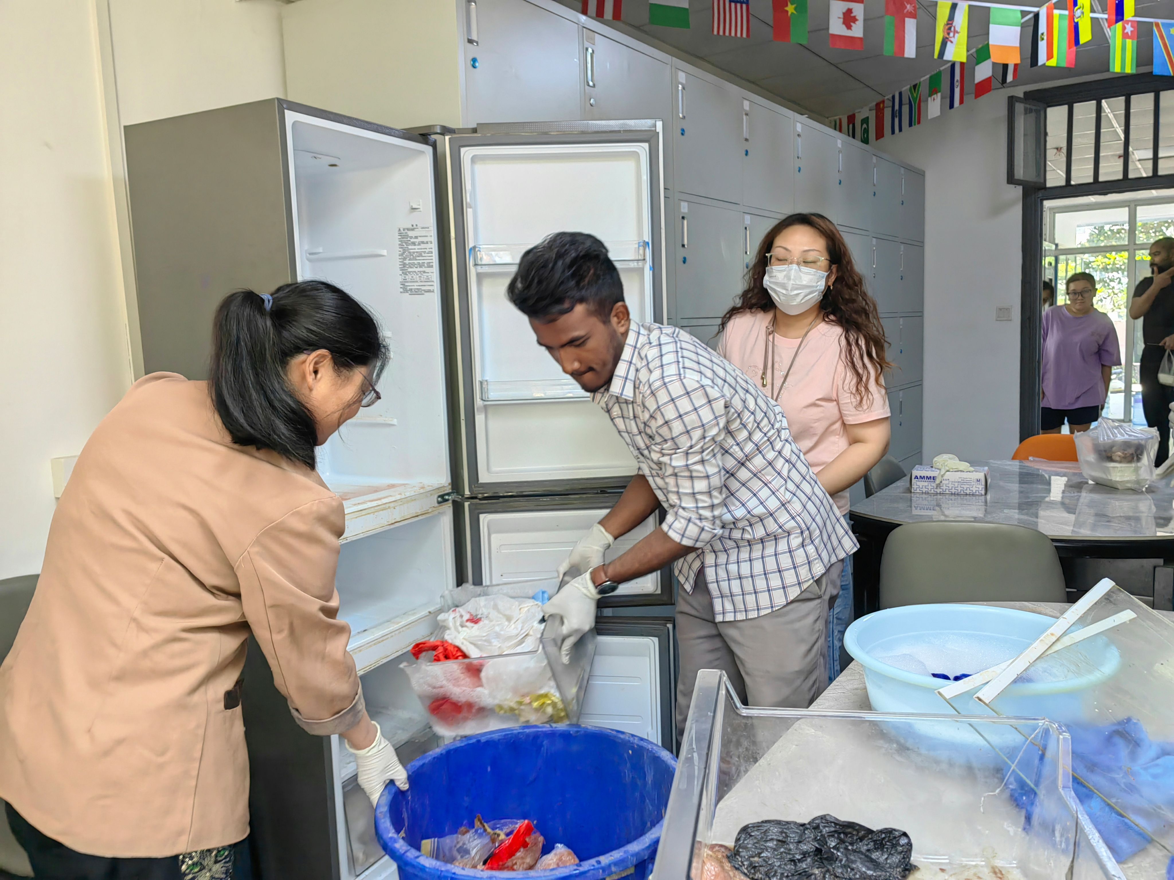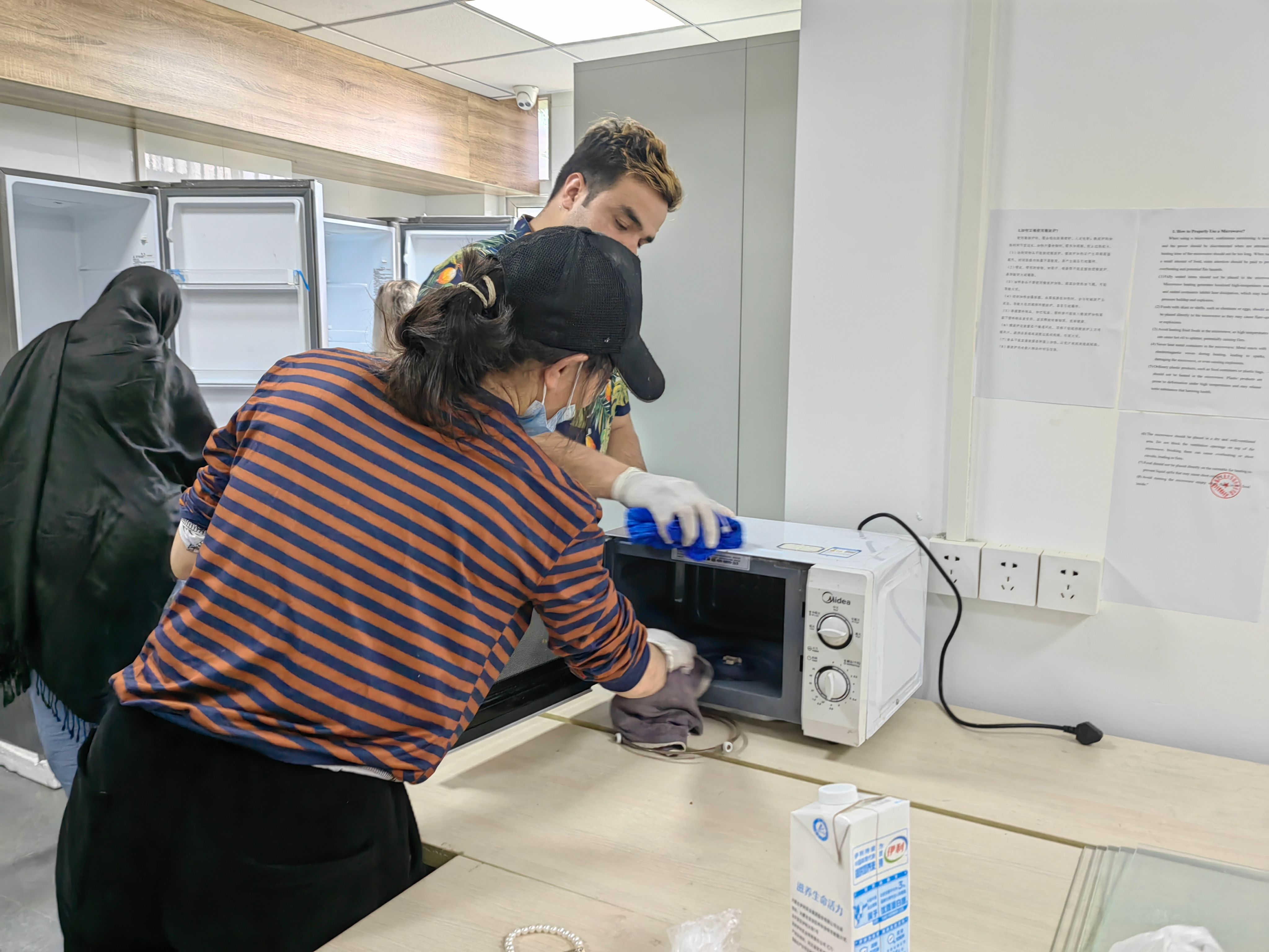 公寓管理人员先对宿舍卫生标准进行细致讲解,引导职工们更好地维护景星苑宿舍环境。随后,在公寓管理人员的示范引领下,职工们纷纷拿起清洁工具,认真打扫公共区域。在劳动过程中,来自不同国家的职工们分工有序、各司其职,有的清扫地面,有的擦拭电器设备,有的整理物品,每个角落都留下了他们辛勤劳动的身影。同学们热情高涨,也切实感受到劳动的不易与快乐。经过两个小时的勤恳清洁和艰苦的工作,公共厨房焕然一新。