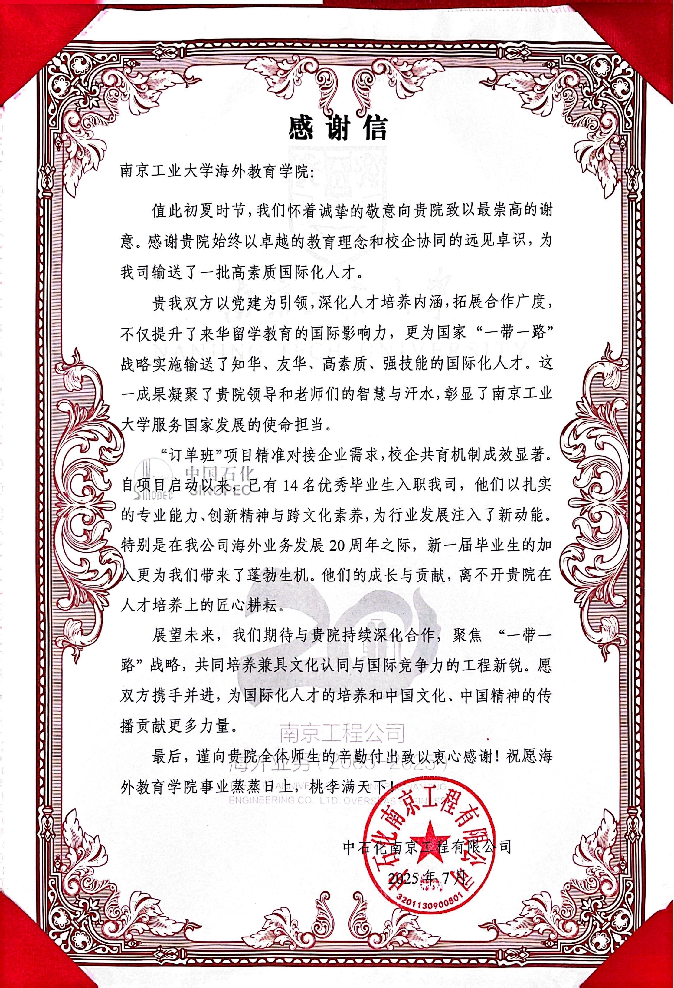 从合作到赞誉--中石化南京工程有限公司致信感谢779cn太阳集团