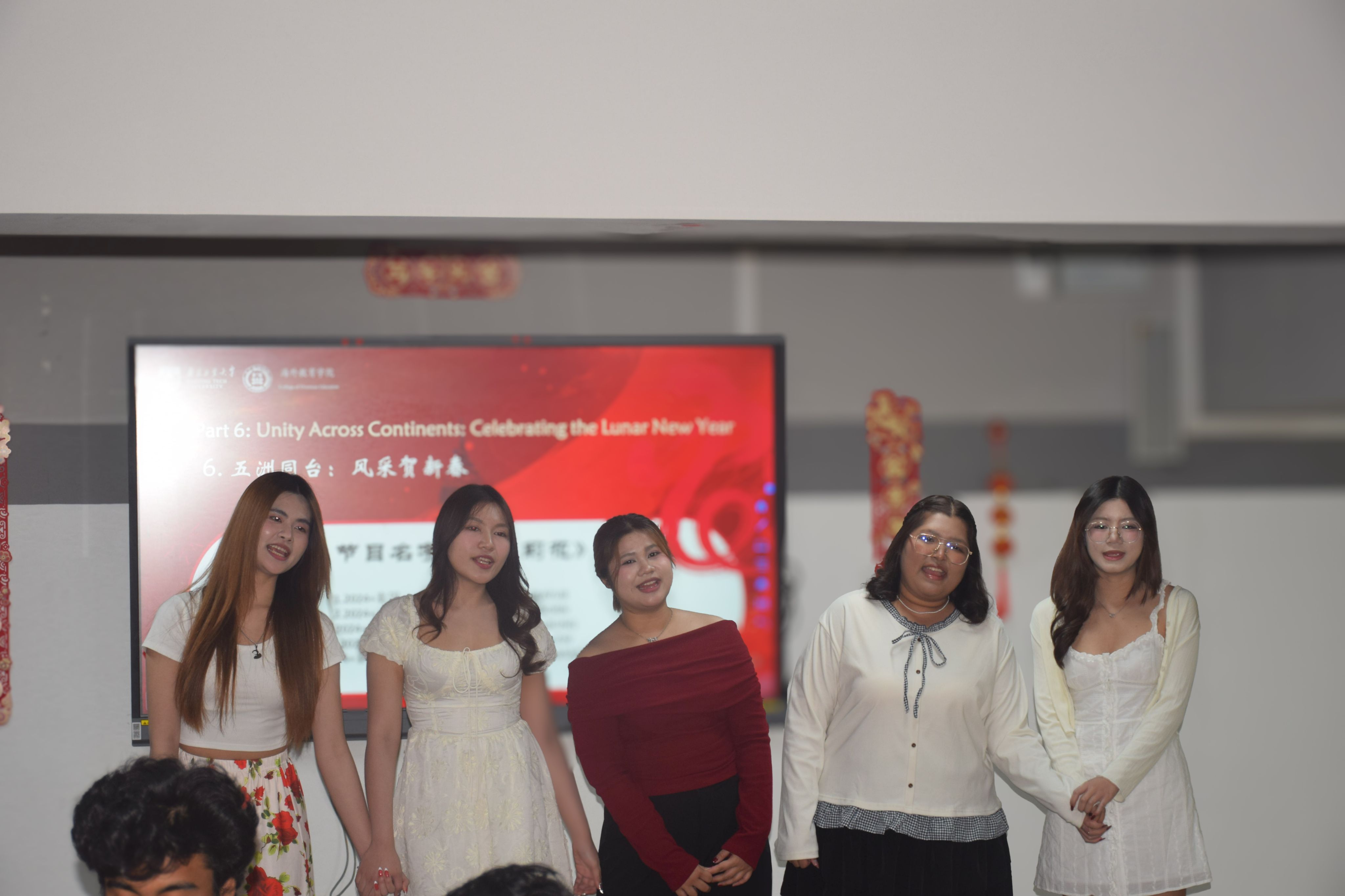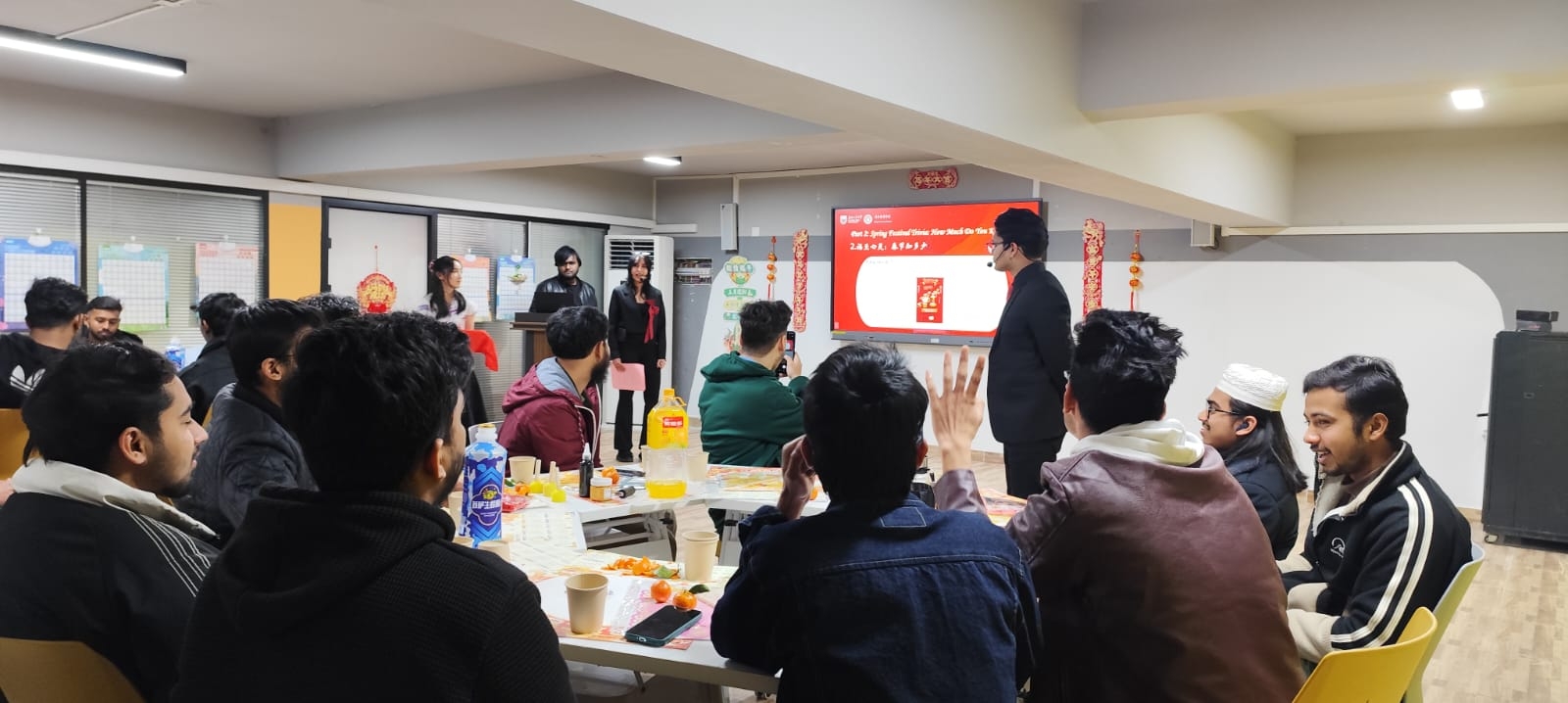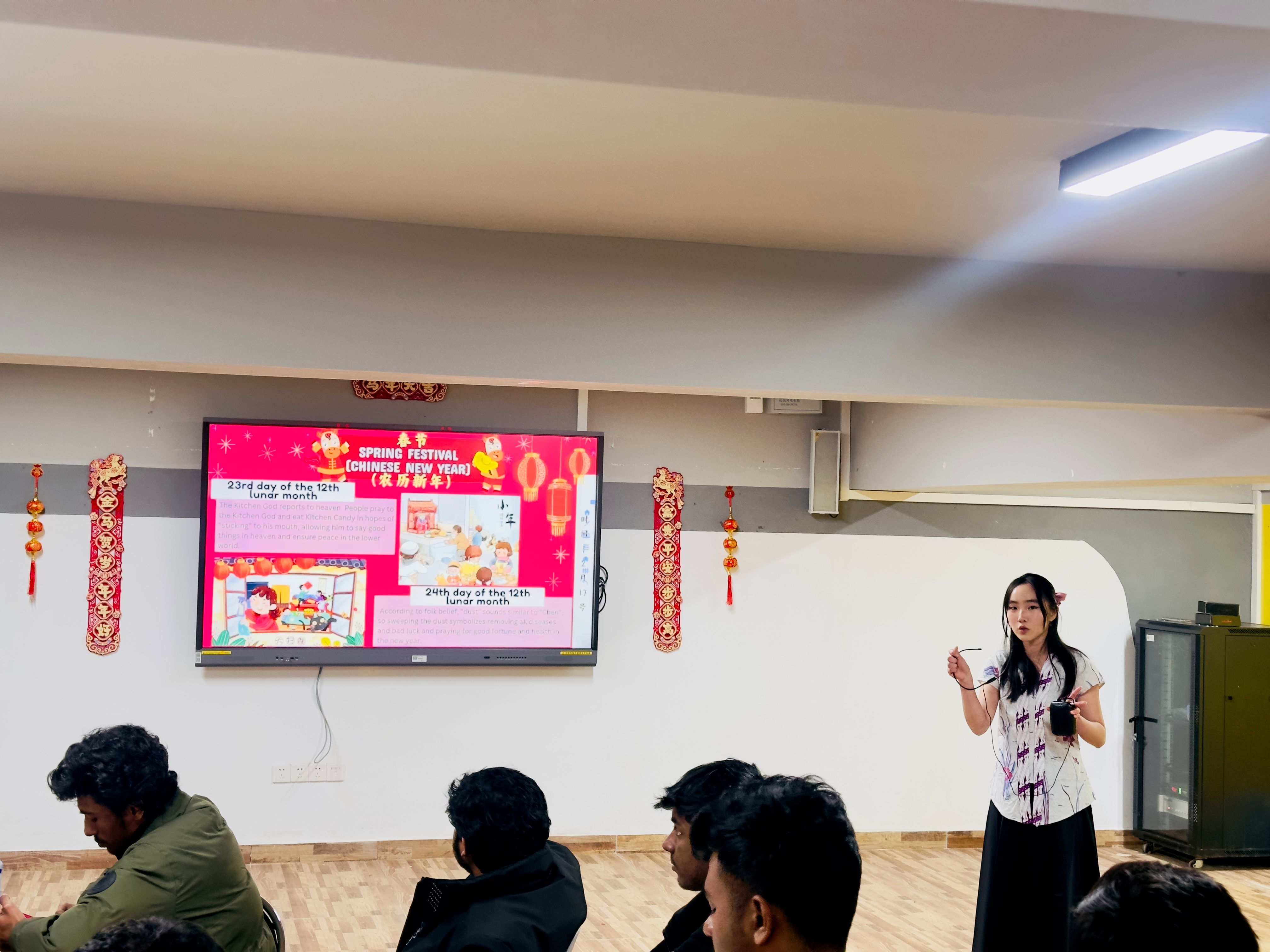 活动在观看中国春节宣传视频的喜庆氛围中拉开帷幕,贴春联、放鞭炮、吃团圆饭等传统习俗画面,将师生们带入浓厚的节日情境。来自印尼的JOLINE GRACELLA LEE(李迎翠),孟加拉国的A B M MASUM SIDDIKY(尼山)和南非的SHAYLEE DANIELLA DE WAAL(雪灵)结合自身在华经历,讲述了他们的中国春节故事,并介绍了各自国家的新年习俗。