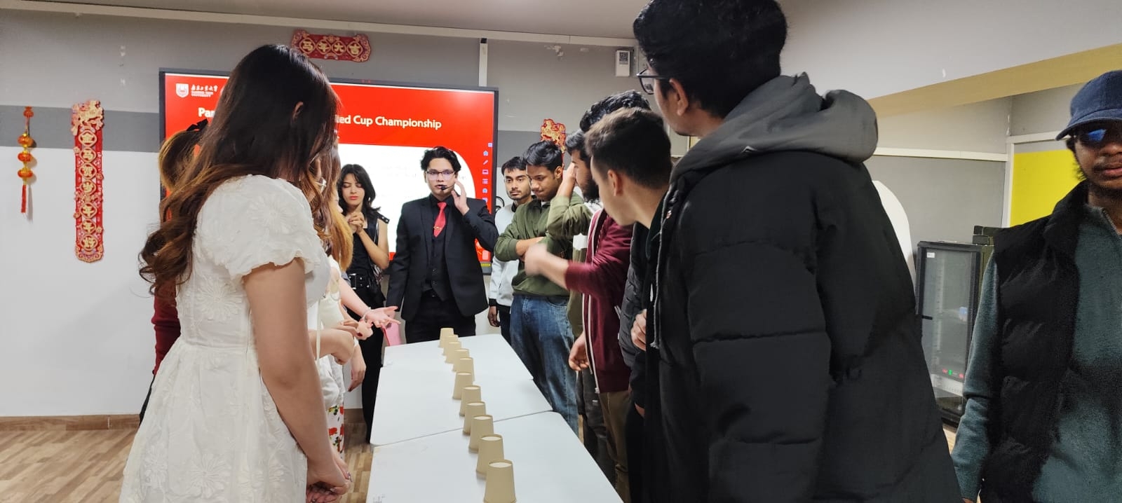 最具互动性的环节龙马精神--巧思猜灯谜充分激发了职工们的智慧与热情。文字灯谜融合中英文,既有传统文化趣味,又兼顾国际员工理解。肢体传谜游戏更是笑点频出,职工们用生动的肢体语言演绎舞狮”“包饺子”“年兽等春节元素,队友们争相猜测,夸张的表演引得全场笑声不断。在马到功成:决胜红杯赛环节,职工们分组对决,反应敏捷、配合默契。随着主持人一声声指令和突然喊出的杯子!,选手们迅速抢夺桌上的红杯,紧张刺激的比赛将现场气氛推向顶峰。